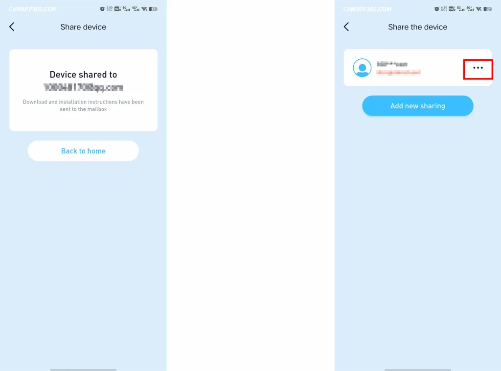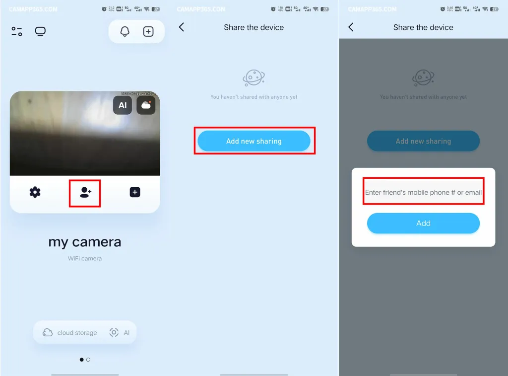 - After sharing, a sharing message will be sent to the email or number you entered, register and login to iCam365 APP and you can start using the camera.