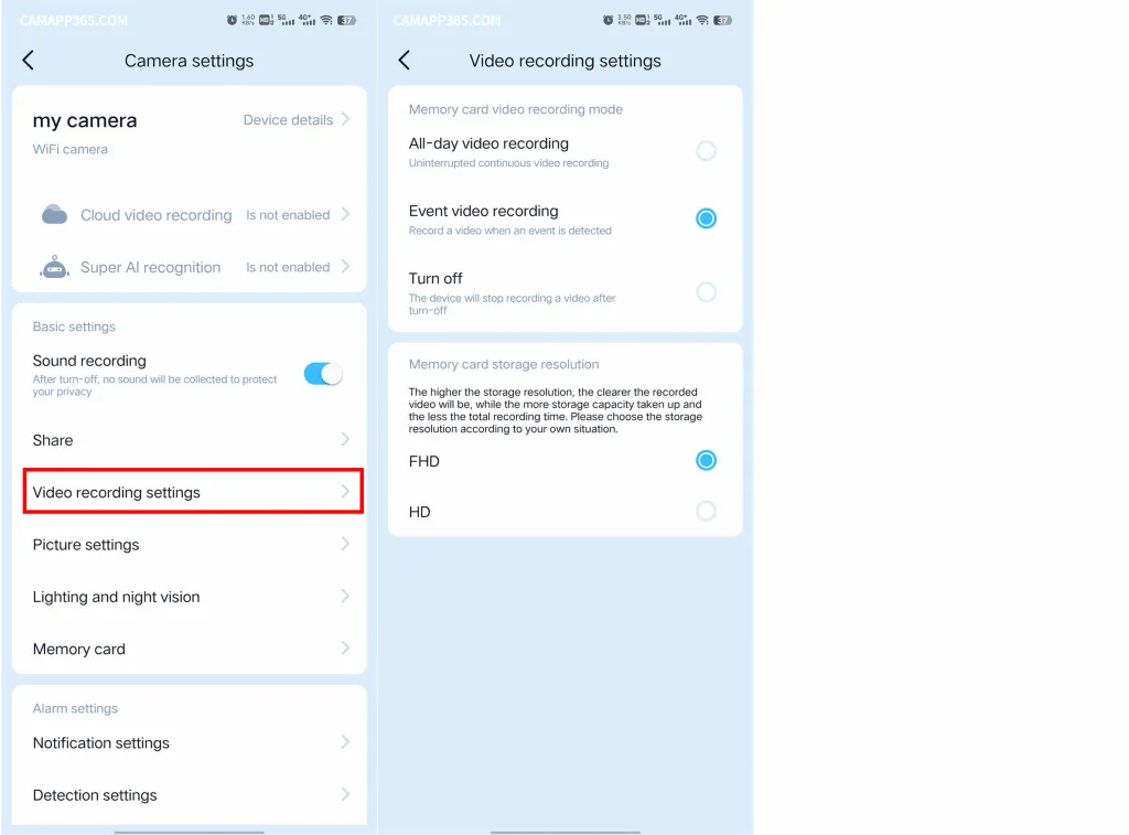 2. Click Video recording settinas, you can set the recording mode and definition here.