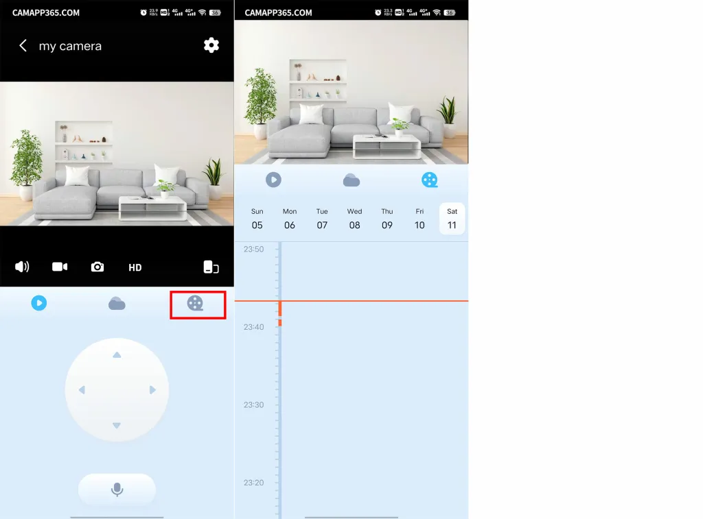 Real-time and Playback: | Click the screen on the device to enter the device real-time page to view the real-time camera screen. You can also switch to Playback to view the historical video. The recording can be divided into event recording and round-the-clock recording. You can select the recording mode as required. |