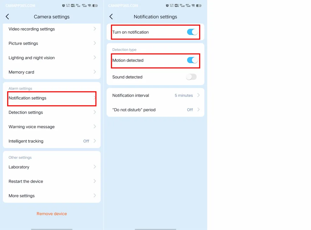 2. Click Notification settings, open Turn on notification and Motion detected to detect and receive alarm notifications.