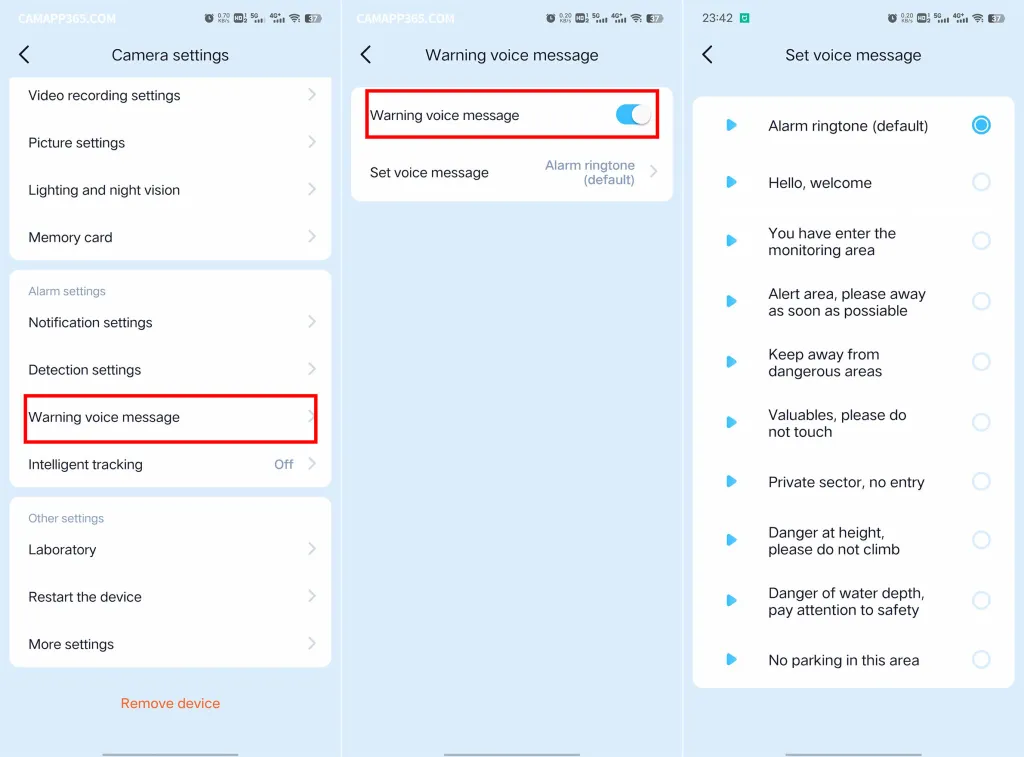 Turn on the Warning voice message, when the SecurityBulb camera detects an intruder, the camera will send a warning voice to scare off the intruder.