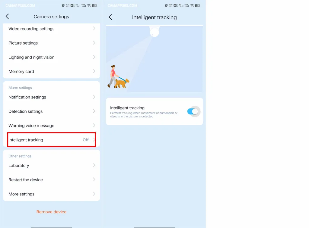 Turn on Intelligent tracking, when SecurityBulb camera detects human or pet movement, the camera will track the movement of the object.