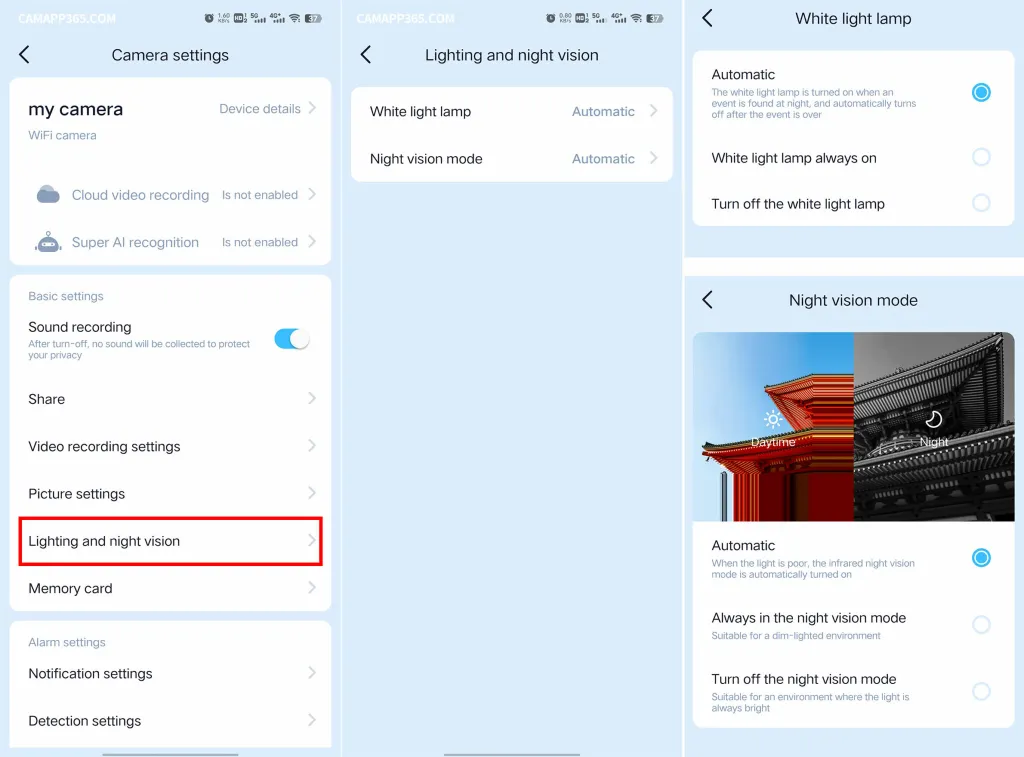 In the Lighting and night vision screen, you can set the light lamp and Night vision mode.