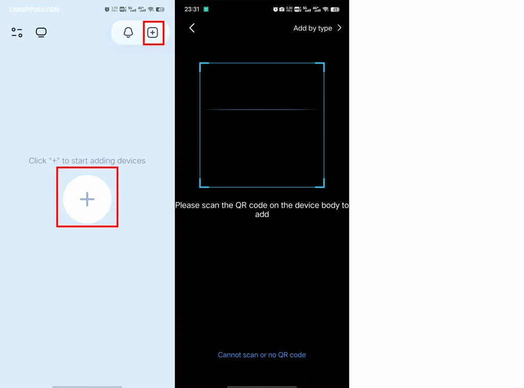 Click the + icon, then scan the QR code on the SecurityBulb camera, the QR code is usually on the bottom or back of the camera. iCam365 APP will show the recommended way to add.