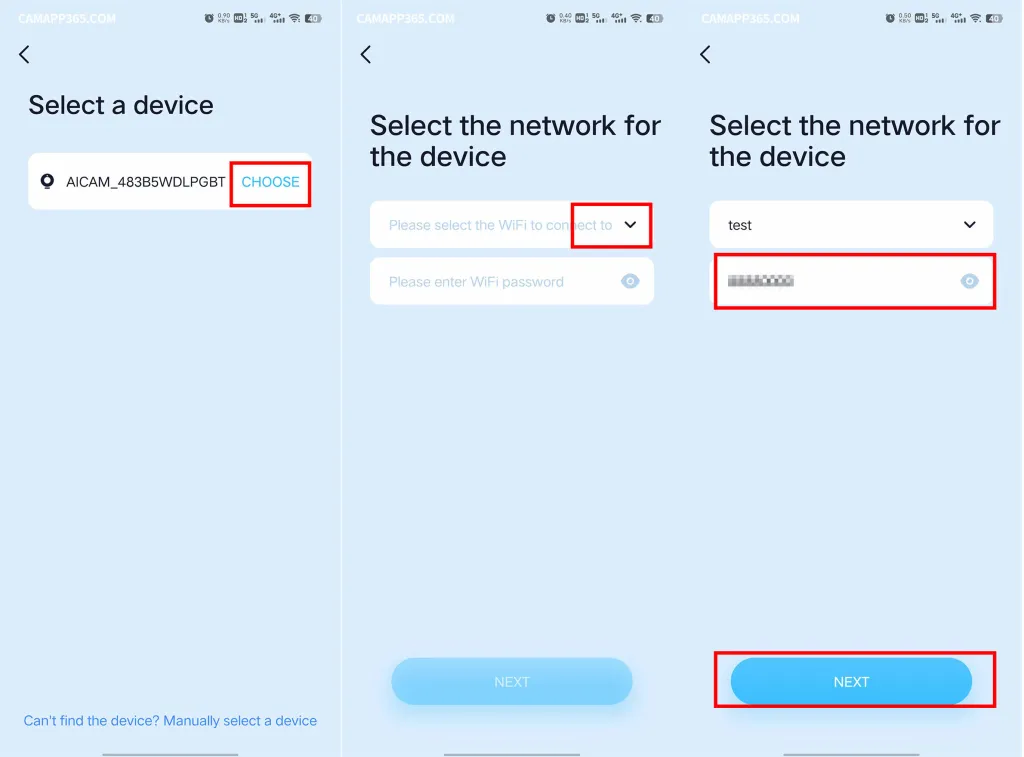 2. Click CHOOSE, click the down arrow icon to select your wifi and enter your wifi password, then click NEXT.